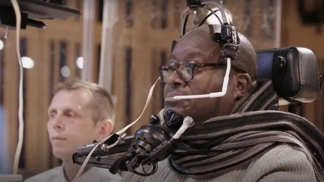 German-born American composer-cum-inventor Rolf Gehlhaar was asked to devise an instrument that Clarence could play. The result was the Headspace Instrument, a computer-based “virtual” instrument, but a real instrument nonetheless. It could be classed as a wind instrument as it is controlled by Clarence’s breath, but is assisted by head movements. The Headspace instrument has been an extremely significant part of Clarence’s rehabilitation. It has facilitated his return to performing and feeling the buzz of being on stage. In short, it has been the platform for making a comeback.